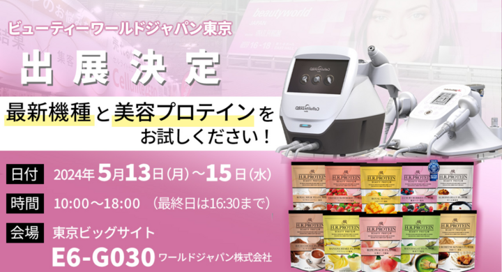 ワールドジャパン株式会社(所在地:東京都渋谷区、代表取締役:大畑慶高(https://esthekiki.com/company/)は、2024年5月13日(月)~15日(水)の3日間、東京ビッグサイト東ホールで開催される美容と健康に関する商材・サービス・情報・技術が集結するビジネス向け総合ビューティ見本市「ビューティーワールドジャパン東京」に出展します。