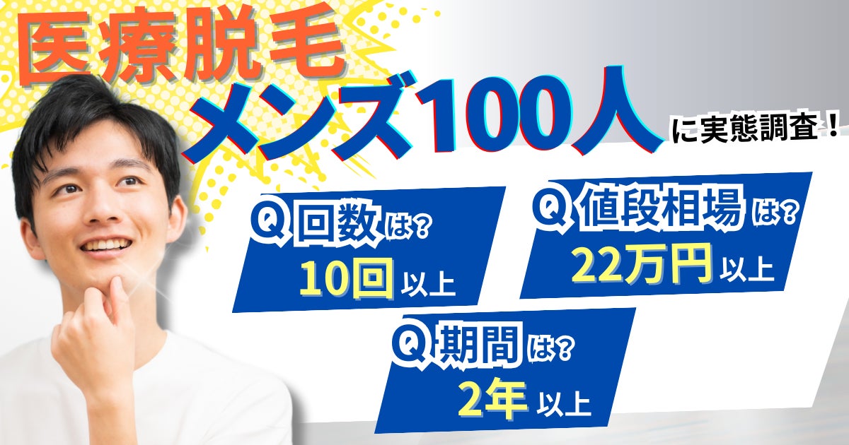 医療脱毛経験者の男性100人にアンケート調査したところ、脱毛にかかった回数は「10回以上」、期間は「2年以上」が最多の回答となりました。