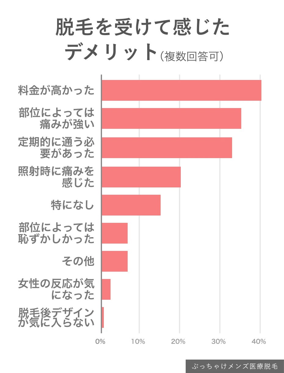 デメリットはないです。あくまでも個人的な感想ですが、自己処理の手間が無くなり清潔感が出たため異性からの評判が良くなったのでデメリットは一切ないからです。