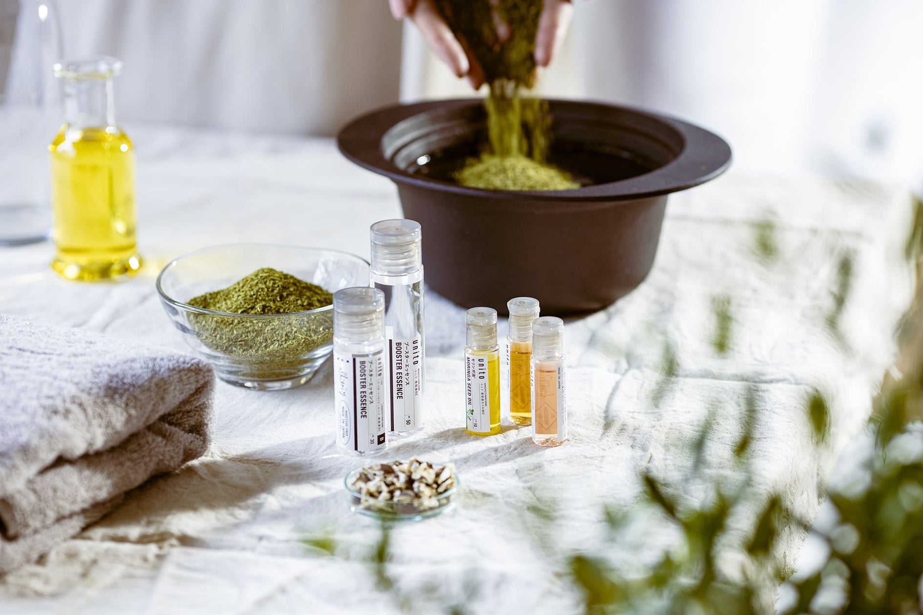 体が温まって汗をかき、まっさらになった体と肌は栄養を欲し、栄養が入りやすい状態です。蒸し終わった直後、原料が持つ力を丸ごと引き出した「unito」の原料原液をお肌にチャージすることで、有用成分を肌にたっぷりと与えて肌の土台*2も一緒に整えてまいります。