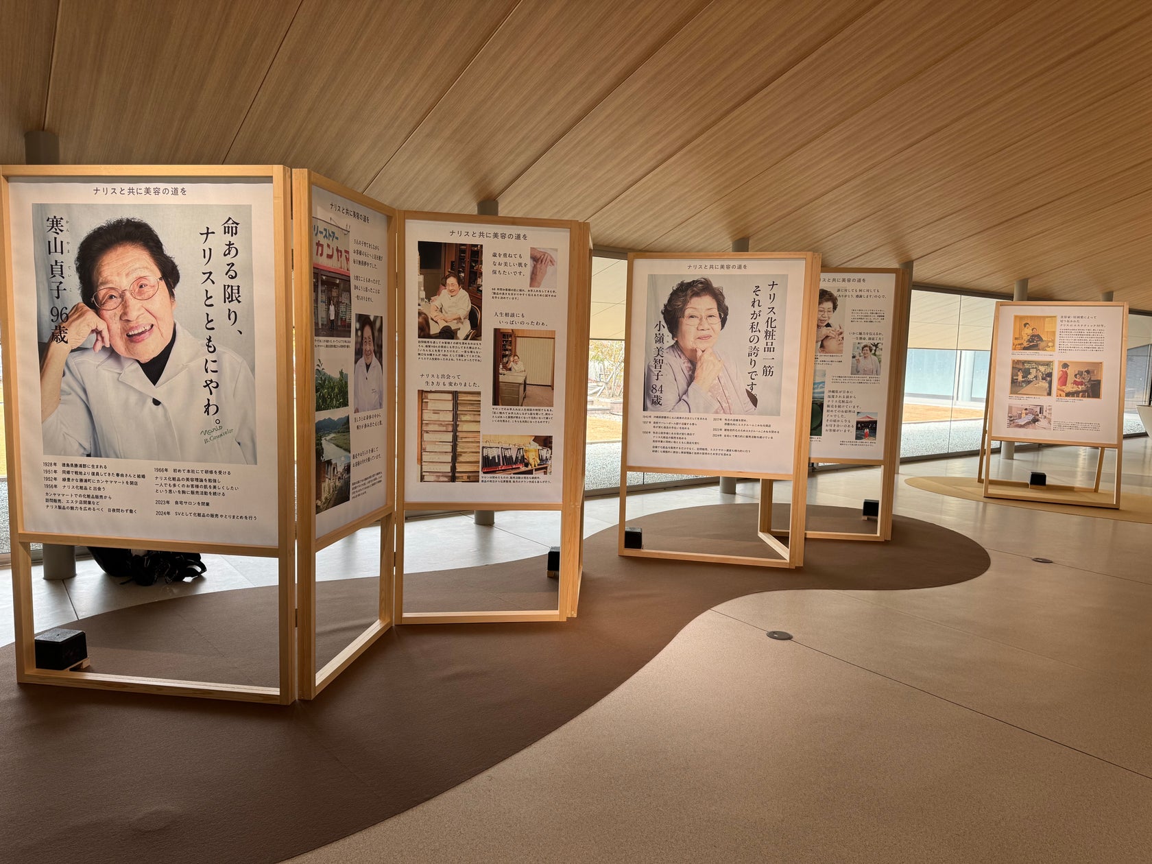 当社は「會陽化学研究所」として1932年に創業し化粧品の製造を開始。当初は百貨店ブランドの化粧品の下請けを行っていましたが、1936年から「ナリス」を商標登録して自社ブランドの販売を開始。1959年から開始した訪問販売事業は当社の主力流通で、現在でも売上の約6割を占めます。1959年当時、副社長であり創業社長夫人であった村岡愛が知識や技術を身に付けることで女性が自立できる職業として訪問販売を定着させた取り組みが今に繋がっています。「ひとのちから」展では、1959年以前から現在も当社の化粧品やエステティックなどの美容に取り組まれている女性(96歳・84歳)と、現在、美容の世界を深めることを目指しているエステティシャン、美に関わる人を研究技術や製品開発で支えたいと願う当社研究開発部員の写真と美への思いを紹介しています。